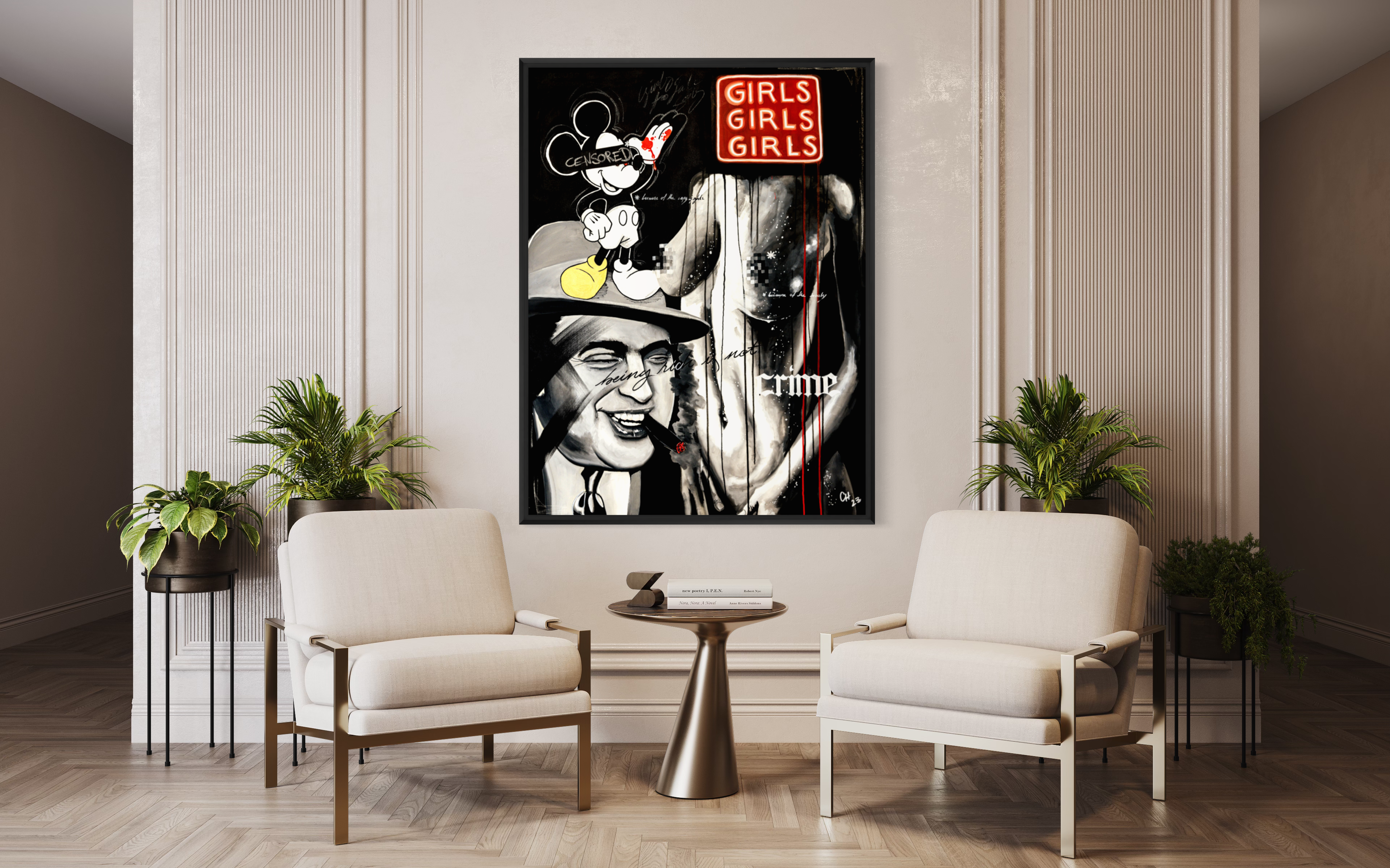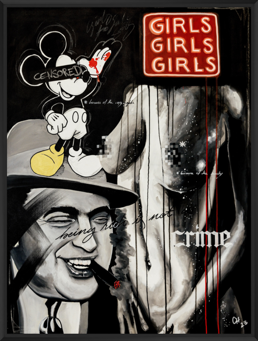 Neben diesen zensierten Figuren erscheint Al Capone mit seiner Zigarre und seinem Hut, eine Figur, die für Macht, Einfluss und die Rebellion gegen gesellschaftliche Normen steht. Seine Präsenz in diesem Bild fügt eine historische Dimension hinzu und verbindet die Themen von Kultur, Medien und Gesellschaft.
