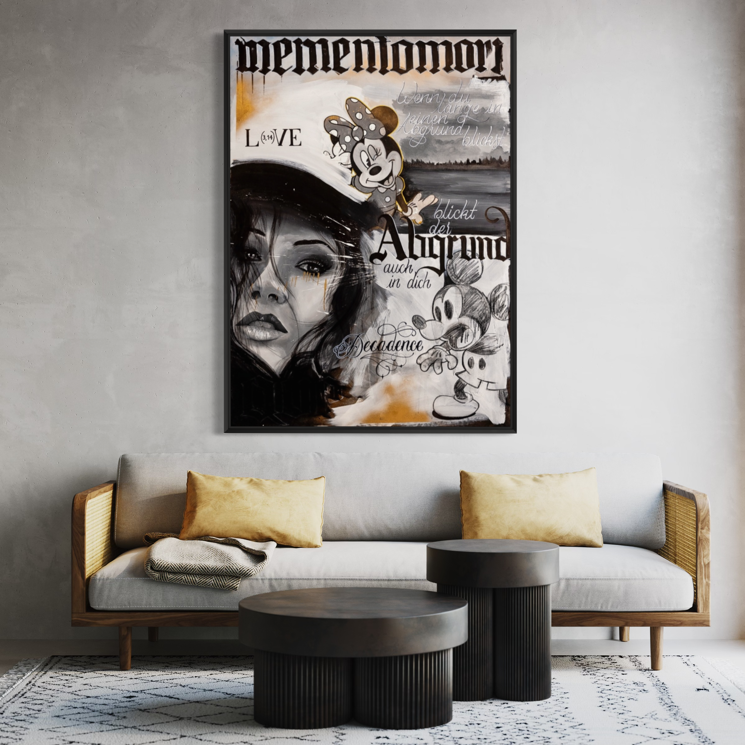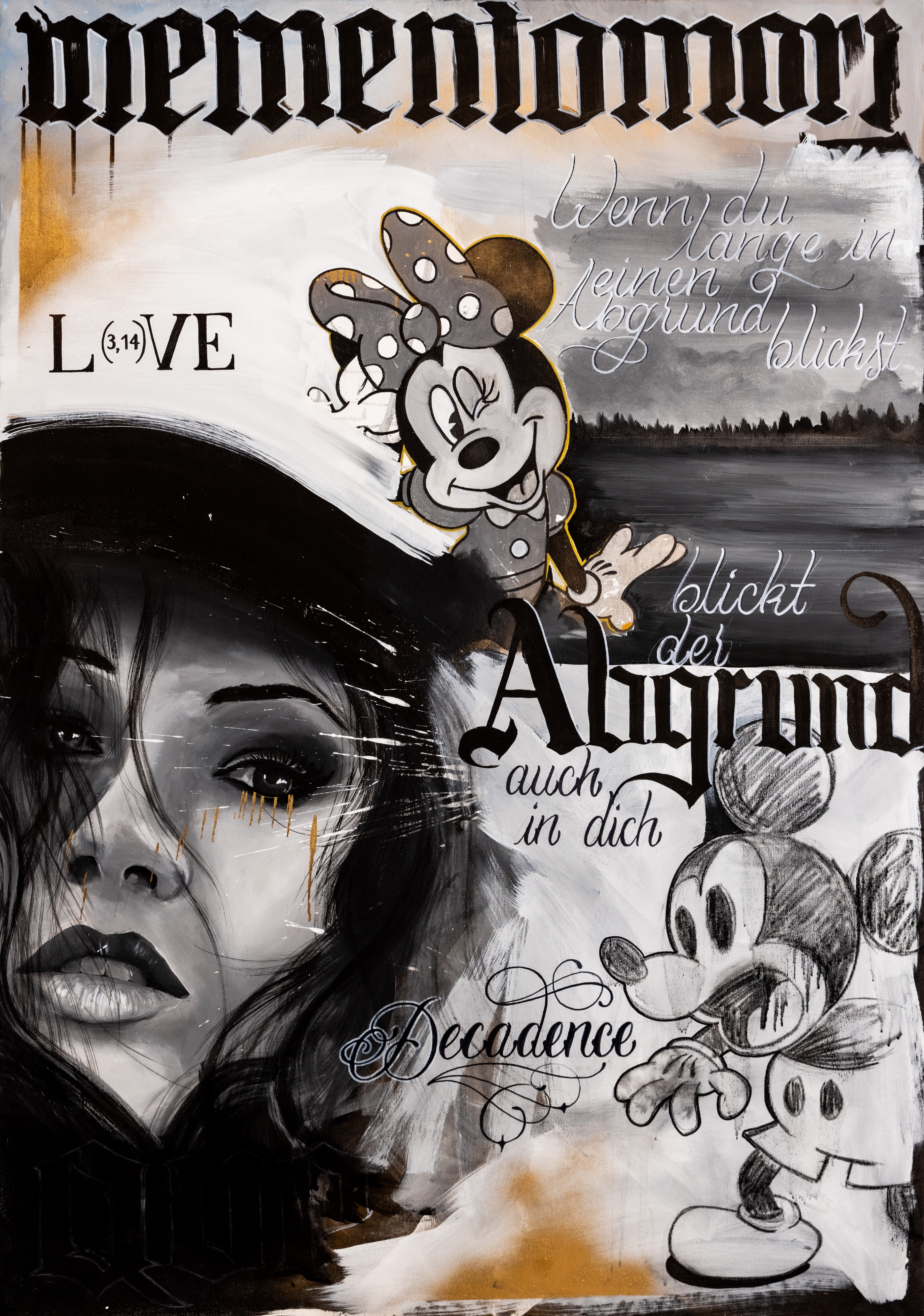 Im Kontrast dazu schreit Mickey Mouse, während Minnie Mouse verführerisch zwinkert. Diese verspielten und lebendigen Charaktere stehen im Dialog mit der ernsten, selbstbewussten Haltung der Dame und fügen dem Kunstwerk eine humorvolle Dimension hinzu, die die gesamte Komposition auflockert.