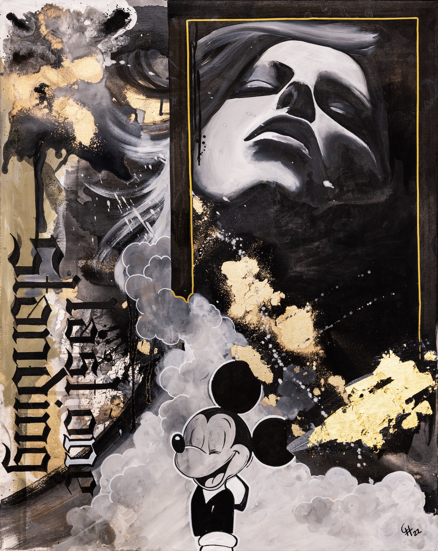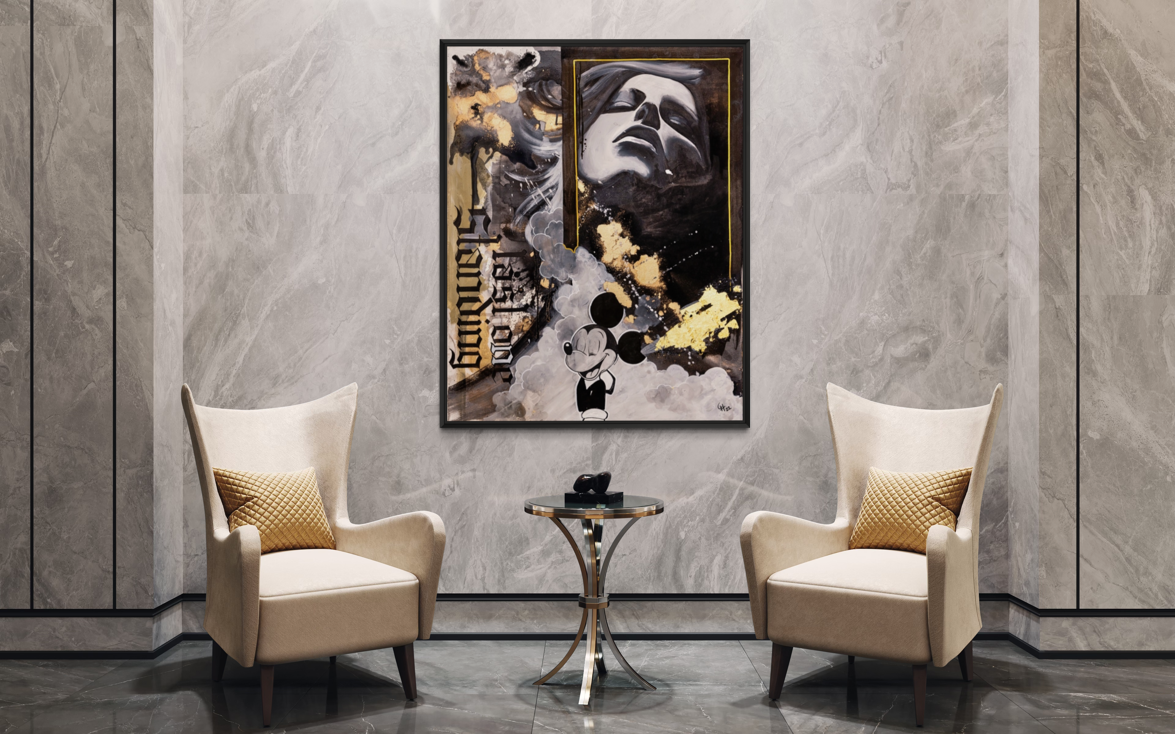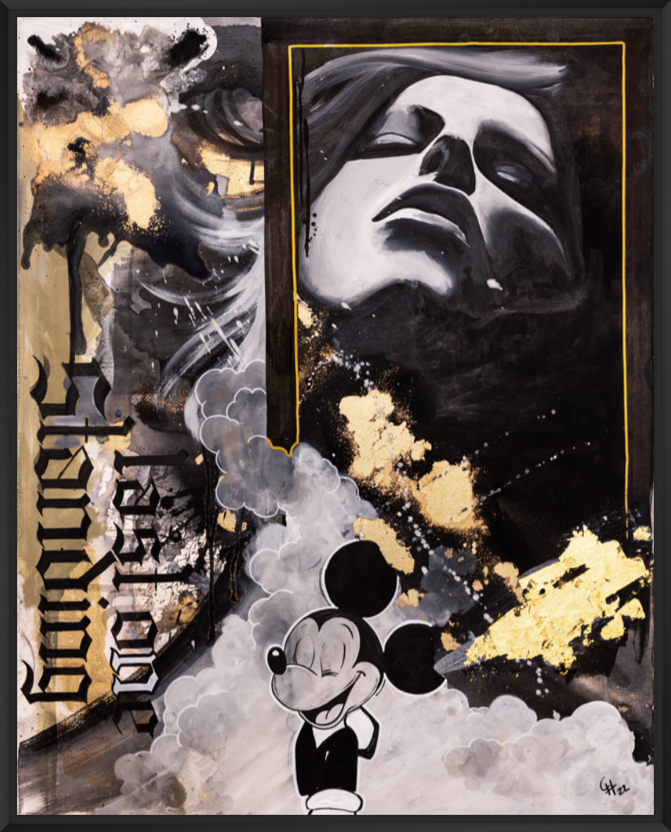 Neben dieser kraftvollen Darstellung befindet sich eine verlegene Mickey Mouse – ein symbolischer Kontrast, der den Gegensatz zwischen kindlicher Unschuld und erwachsener Stärke aufzeigt. Diese Kombination aus Fragilität und Kraft spricht tiefere Themen der menschlichen Erfahrung an und regt zum Nachdenken an.