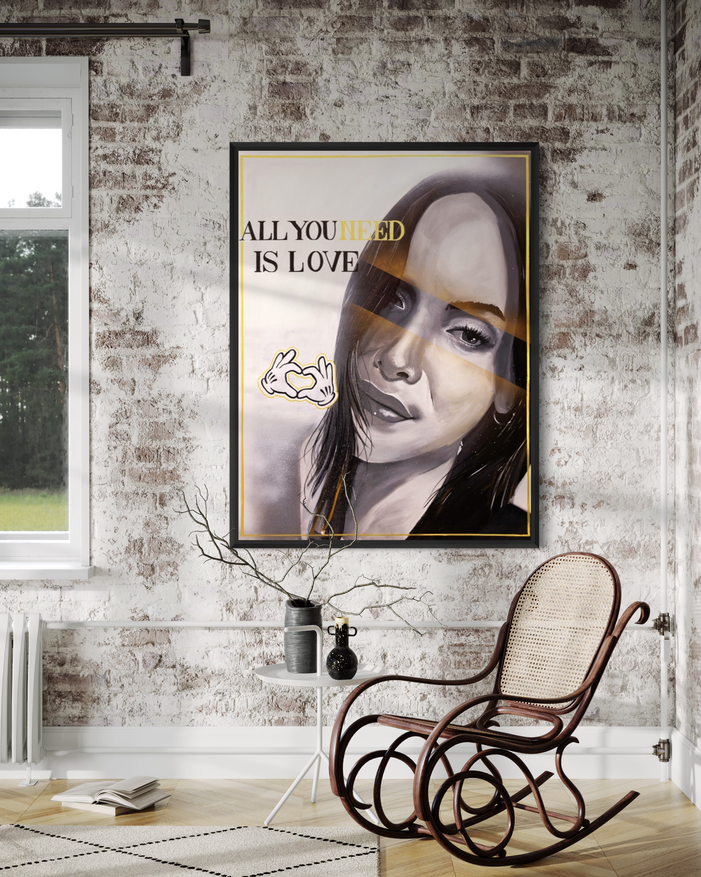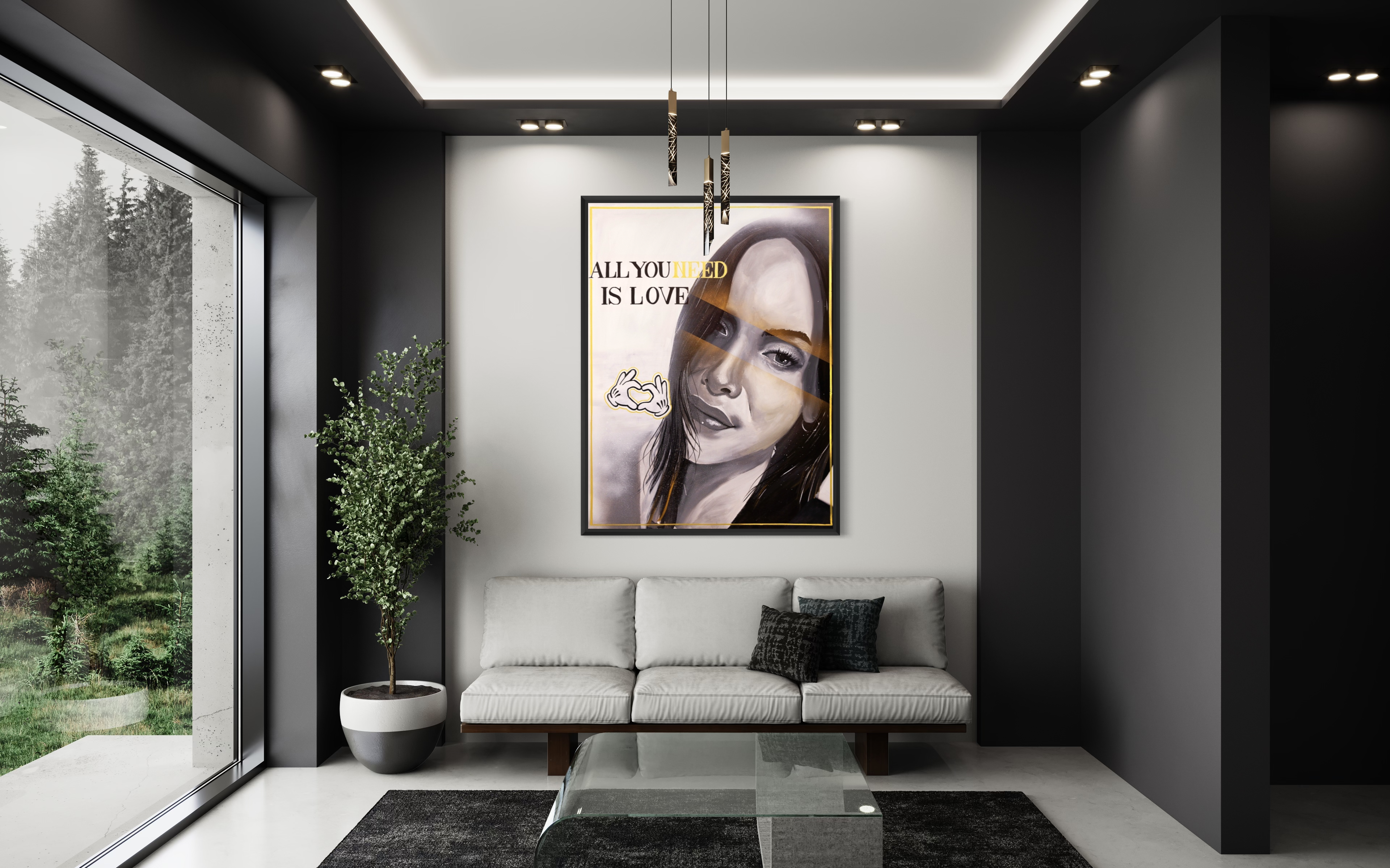 „All you need is love“ ist ein Kunstwerk, das sowohl im Wohnzimmer als auch im Büro oder in persönlichen Räumen zum Hingucker wird. Die starke Ausstrahlung der dargestellten Frau spricht von Selbstbewusstsein und Ruhe. Es ist ein Kunstwerk, das nicht nur den Raum schmückt, sondern eine subtile, kraftvolle Atmosphäre schafft.