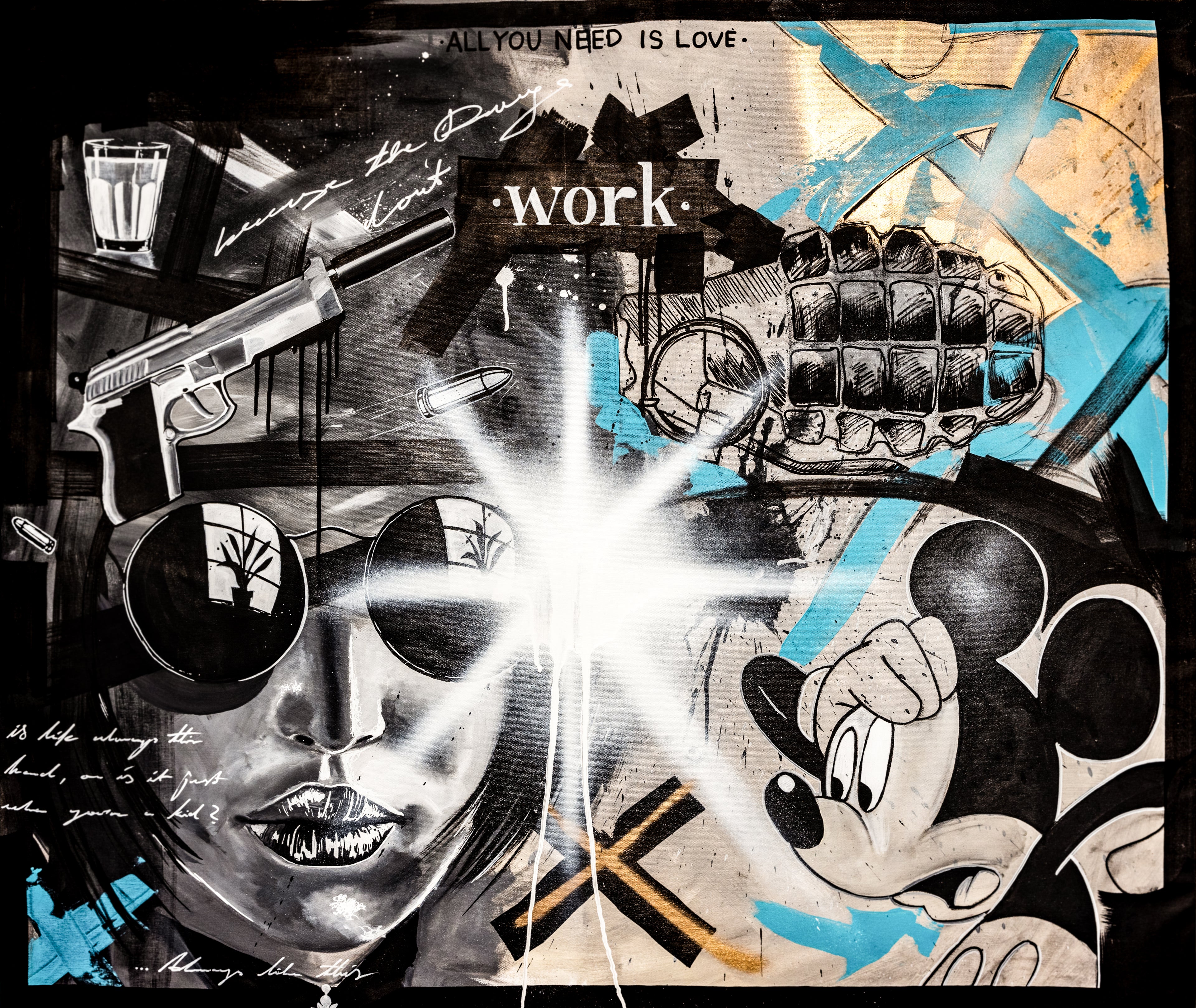 Ein Meisterwerk, das Kunst, Filmikonen und subtile Botschaften vereint: Die Leinwand „Mathilda – Léon der Profi“ fängt die rebellische Ausstrahlung und den unverwechselbaren Stil einer der kultigsten Figuren der Filmgeschichte ein. Mathilda, mit ihrer markanten Sonnenbrille, steht im Zentrum des Bildes – umgeben von vieldeutigen Symbolen wie einer Granate, Mickey Mouse und einem Glas, die Raum für Interpretationen lassen. Der kleine Schriftzug „work“ fügt dem Gesamtbild eine nüchterne, fast ironische Note hinzu.