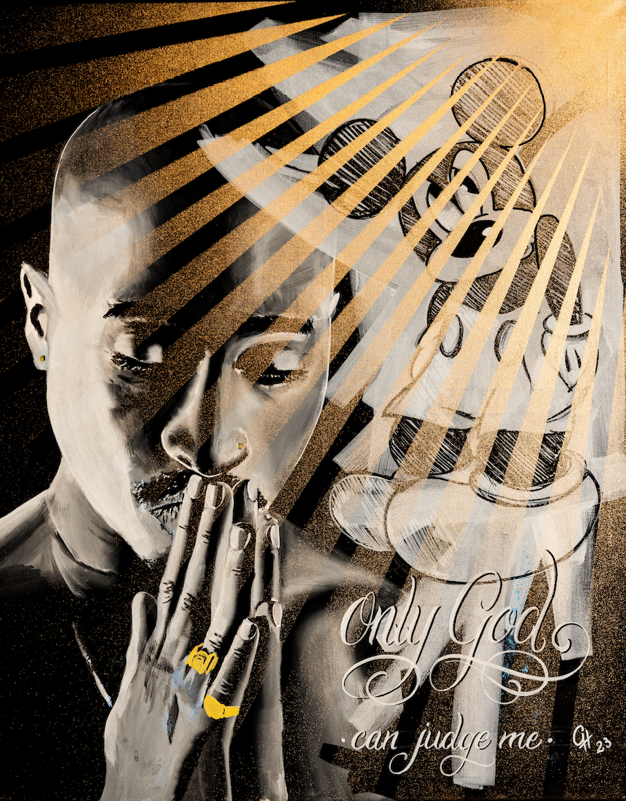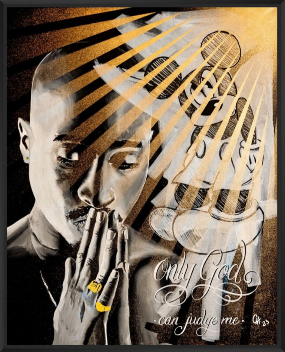 „Only God Can Judge Me“ von Sleeping Society ist ein ausdrucksstarkes Kunstwerk, das den legendären 2Pac auf einzigartige Weise porträtiert. In einer betenden Haltung zeigt er sich als Symbol für inneren Frieden, Stärke und seinen unerschütterlichen Glauben an sich selbst und seine Überzeugungen. Der goldene Schein im Bild steht für die Verlockungen von Reichtum und Macht, während die verwunderte Mickey Mouse, die zum Schein hinaufschaut, das Spannungsverhältnis zwischen Unschuld und Konsumkultur verkörpert.