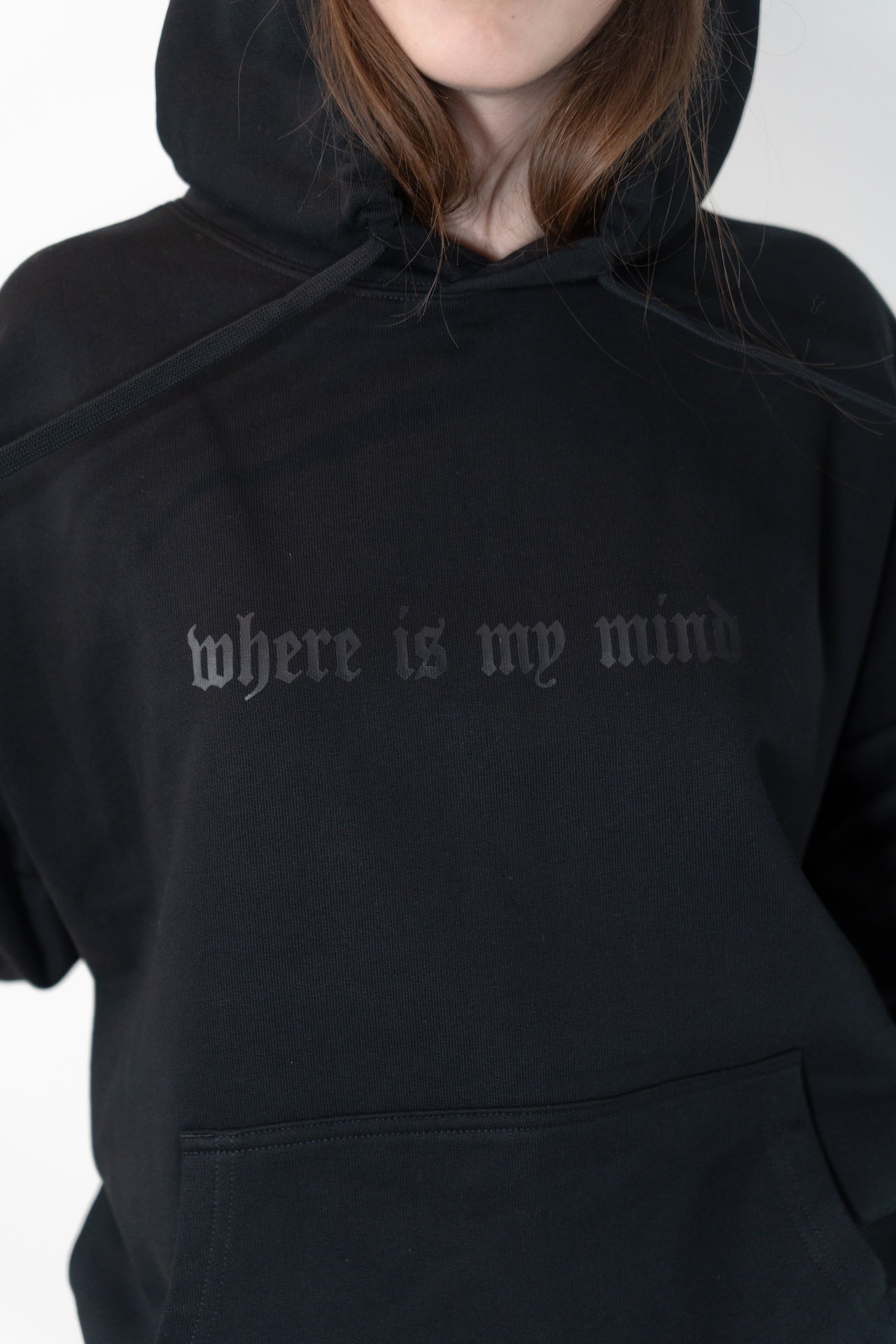 Oversize Hoodie "where is my mind", Vegan, OEKO-TEX zertifiziert & Mitglied der Fair Wear Foundation, Material: 100% biologische Baumwolle, Farbe: Schwarz, Oversized-Schnitt, Sozialstandards in der gesamten Lieferkette, Made in Bangladesch, Veredelt am Chiemsee with love, Versand innerhalb Deutschland: 3-7 Tage mit DHL goGreen